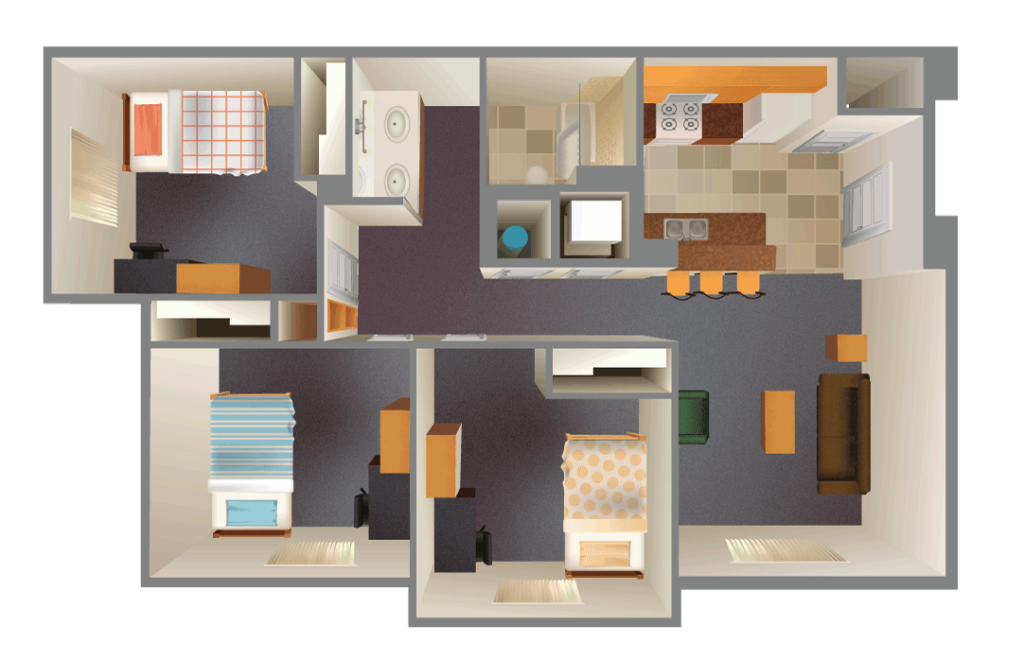At McKay Village, you’ll find a space that supports your academic and personal life. Choose from four apartment layouts, each featuring a fully equipped kitchen, spacious living area, and a washer and dryer for ultimate convenience.