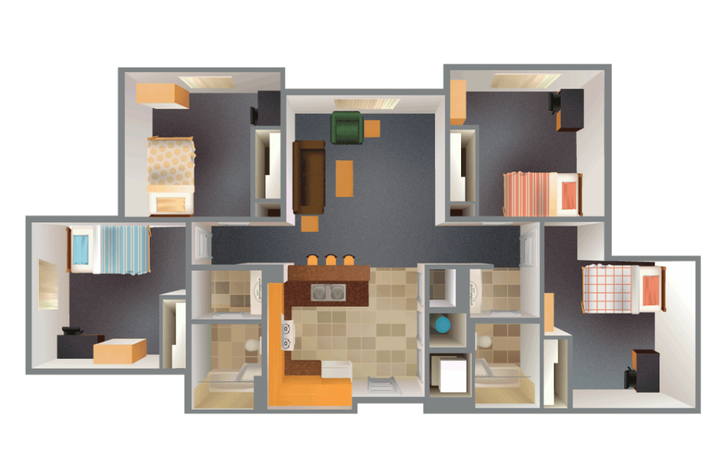 - Four-bedroom, two-bathroom (private bedrooms, four students)