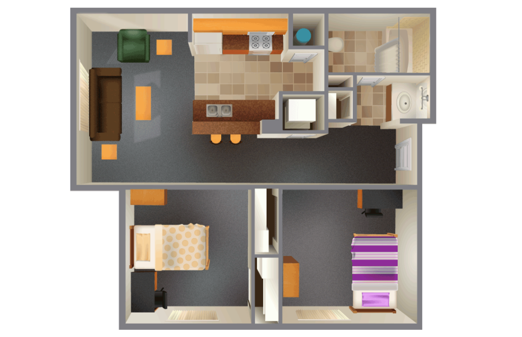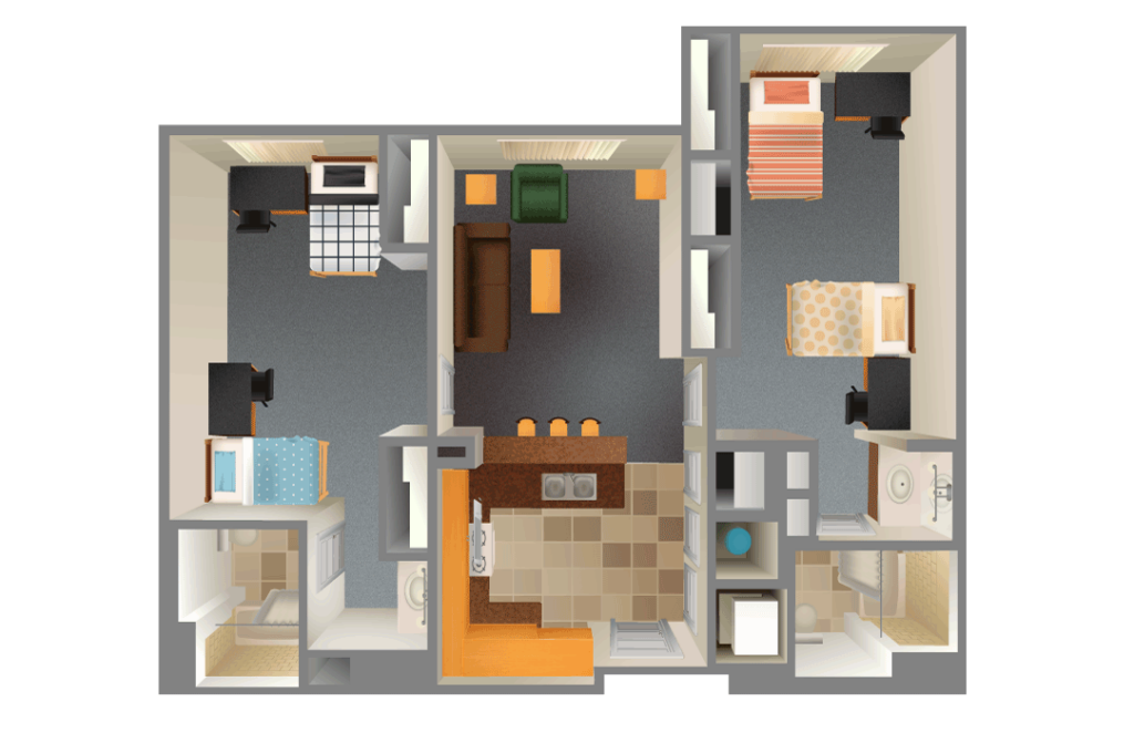 - Two-bedroom, two-bathroom (shared bedrooms, four students)