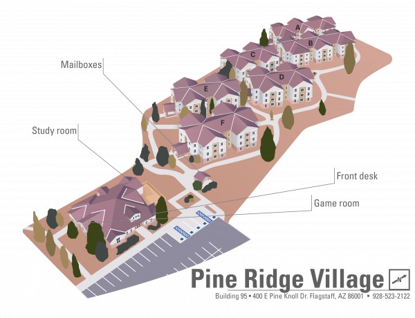 Located on south campus just steps from the J. Lawrence Walkup Skydome, Pine Ridge Village is close to the DüB Dining District and offers easy access to the Flagstaff Urban Trail System (FUTS). The Village also features a community center with a front desk, game room, study space, and a fireplace.