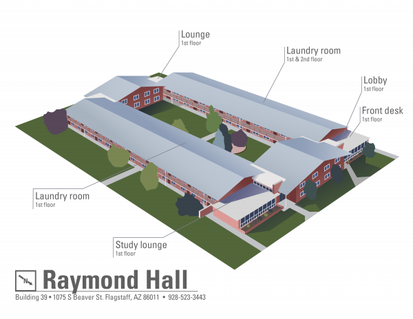 As part of The Courtyards, residents enjoy study lounges, social areas, and an inner courtyard. The hall is named in honor of Dr. R.O. Raymond, a Flagstaff physician and early supporter of NAU through land and scholarship donations.