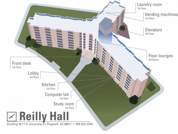 Reilly Hall is a coed, traditional-style community for primarily first-years and sophomores. At seven stories tall, it offers incredible views of the San Francisco Peaks. Inside, you'll find a computer lab, laundry facilities, a small gym, and a community kitchen—plus floor lounges perfect for studying. With the intramural fields right next door, it's easy to stay active and make the most of campus life.