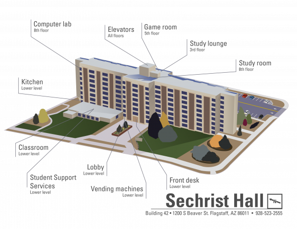 Sechrist Hall offers a traditional-style, coed living experience and is home to primarily first-years and sophomores. As the tallest building in northern Arizona, Sechrist provides stunning panoramic views and easy access to campus amenities like the Union, the Health and Learning Center, and intramural fields.